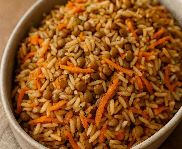 Refeição prática e nutritiva com arroz macio, lentilha rica em fibras e cenoura fresca, simples,