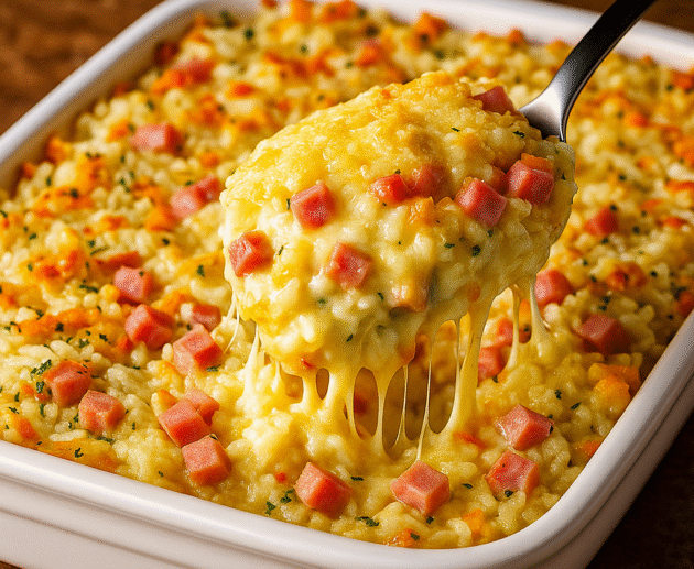 Arroz gratinado com queijo e presunto, cremoso e cheio de sabor, ideal para transformar qualquer