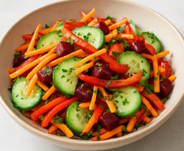 Salada fresca e colorida com legumes variados, crocante e cheia de sabor, perfeita para acompanhar
