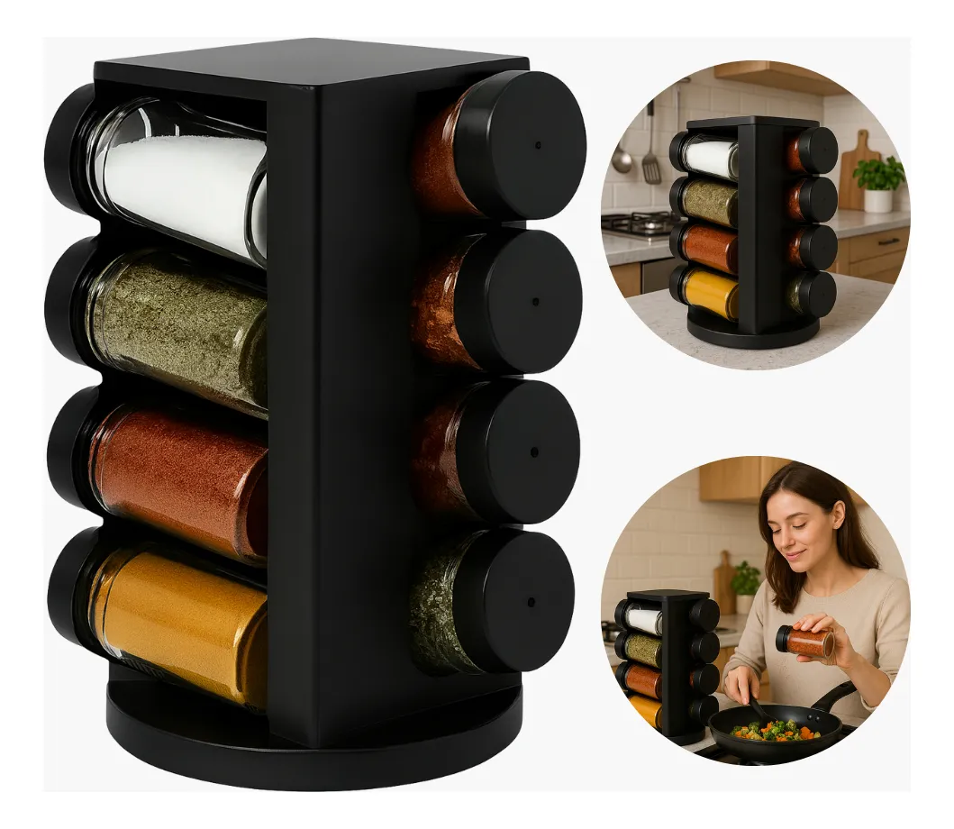 Organização, praticidade e estilo para sua cozinha! Porta temperos giratório com 8 potes de 80 ml em vidro, design moderno e funcional para deixar seus condimentos sempre à mão.
